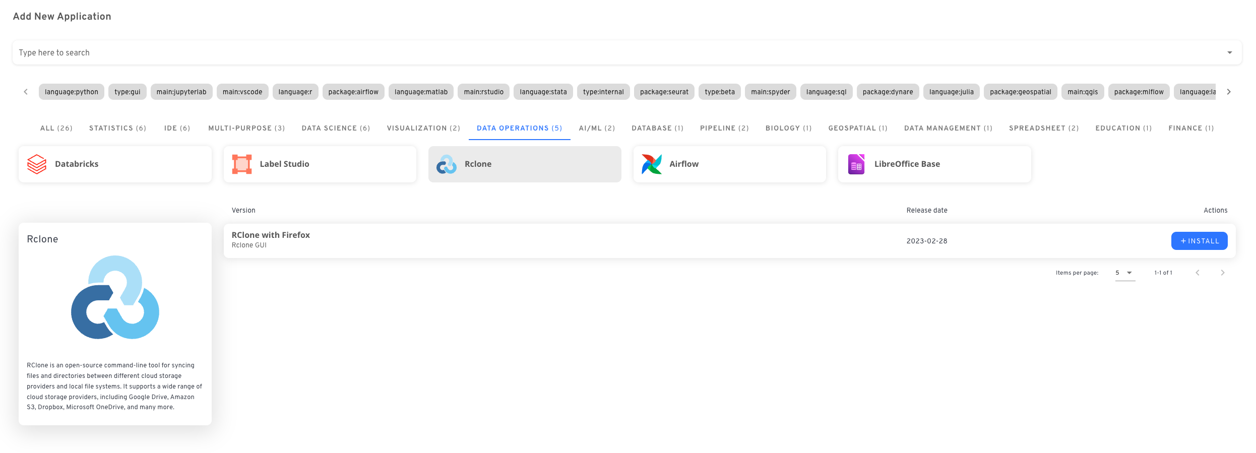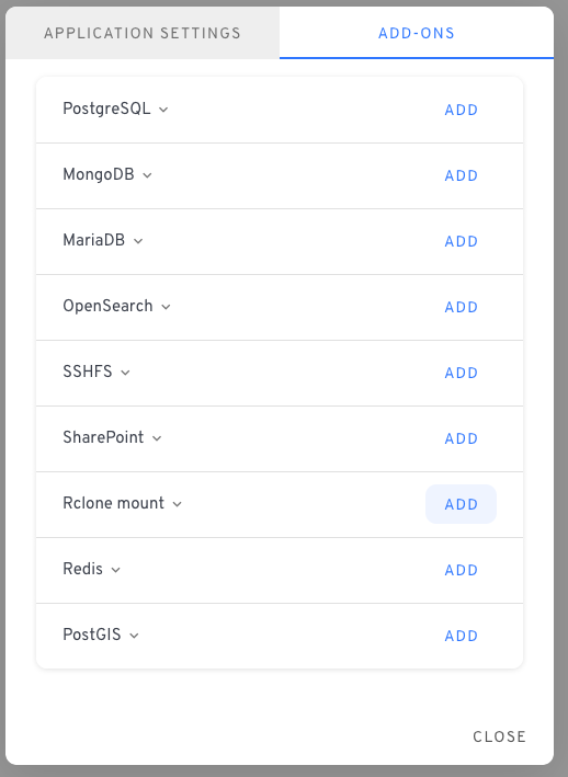 Once your Rclone remote has been configured, you can add the *Rclone mount add-on* to your application in the application configuration:
