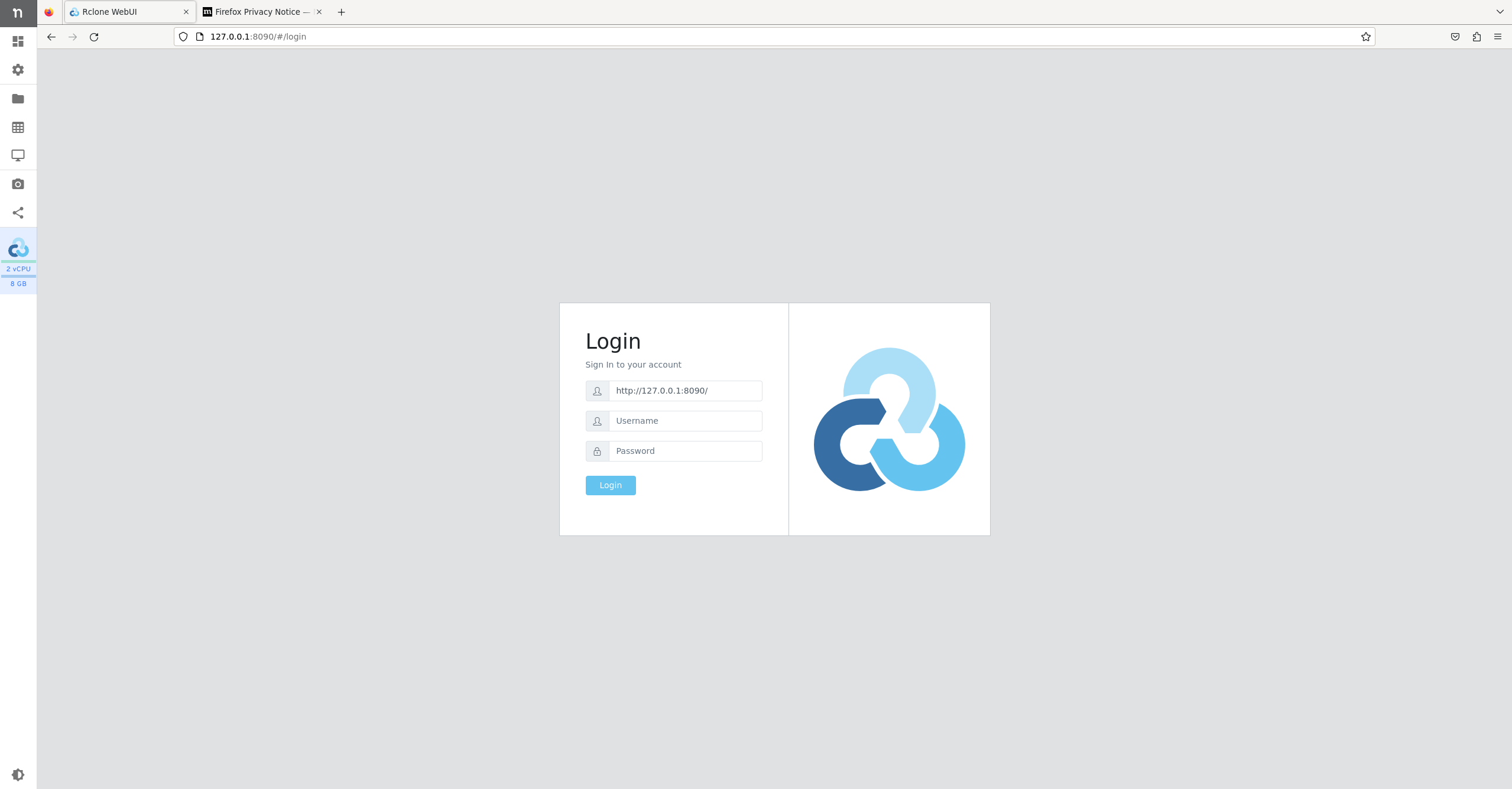 Start the application, and click on the *Login* button to navigate to the Rclone dashboard. No username or password is required: