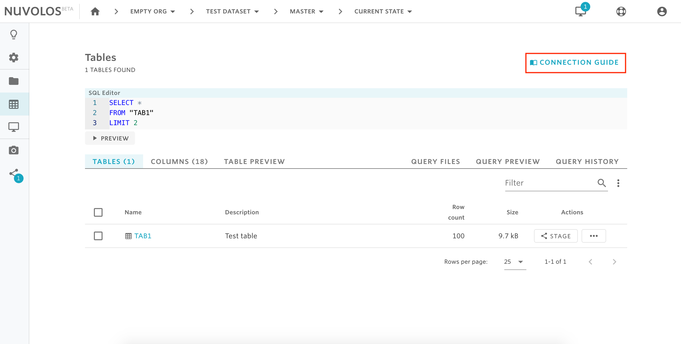 Obtain access tokens and database/schema names from the Connection Guide on the Nuvolos tables interface.